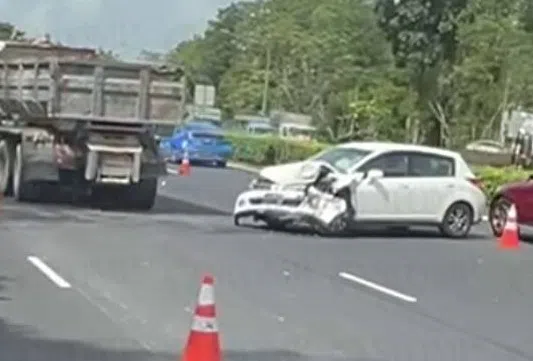 Stomper Lim shared a video of the accident's aftermath showing the damaged white Nissan car behind two tipper trucks and a trailer on the expressway.