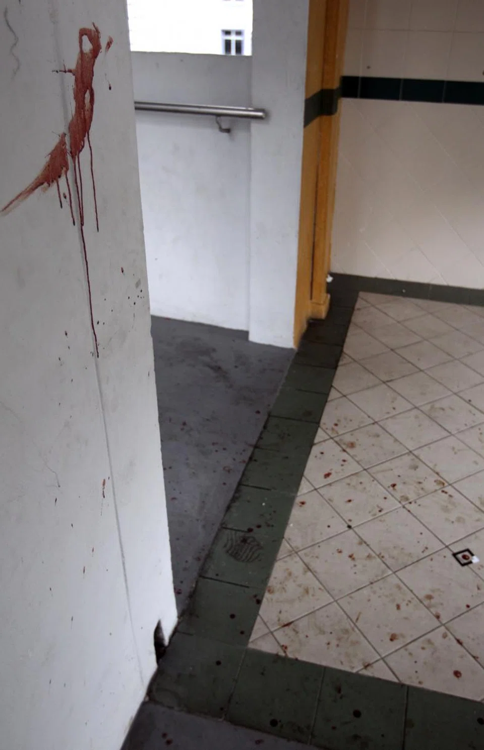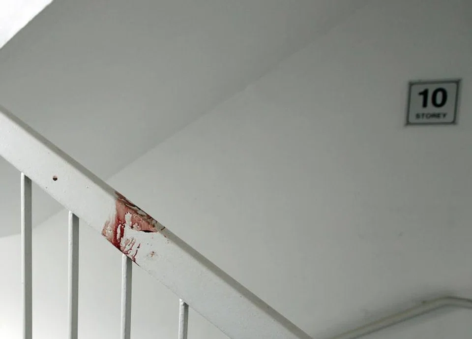 When reporters visited the scene, blood stains were seen on the wall, floor and railing of the 10th storey staircase landing.