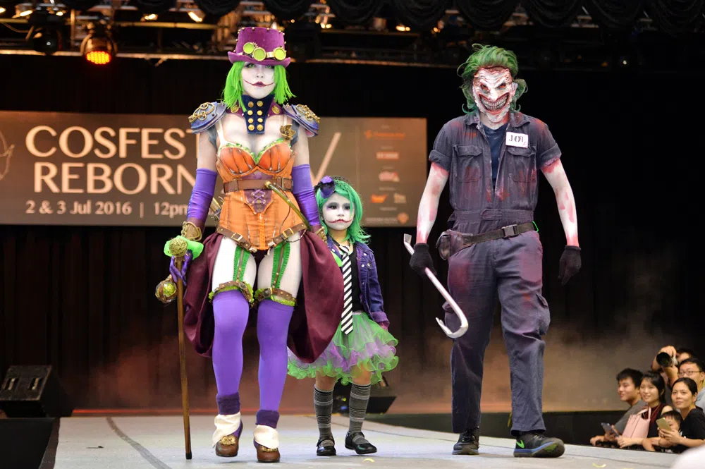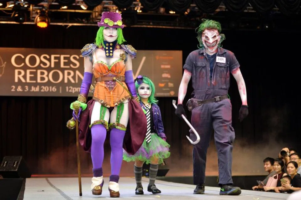 During the DC Comics Super Runway segment last Saturday, a 33-year-old stay-home mum, who wanted to be known only by her cosplay moniker Yugana Senshi, her six-year-old daughter whom she calls Yugana Mini-me and her male friend Fredrick Paras, 21, paraded as a Joker "family".