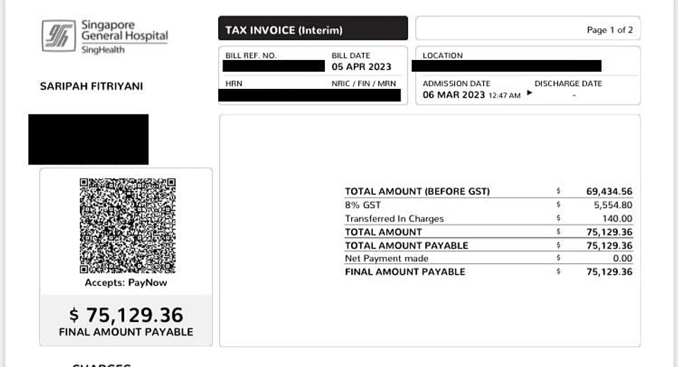 Ms Nadiah had insured Ms Saripah for $15,000, and another $10,000 for repatriation, but was still left with thousands of dollars to pay. As of April 5, the interim hospital bill was estimated at around $75,000, with repatriation costs at around $5,000.