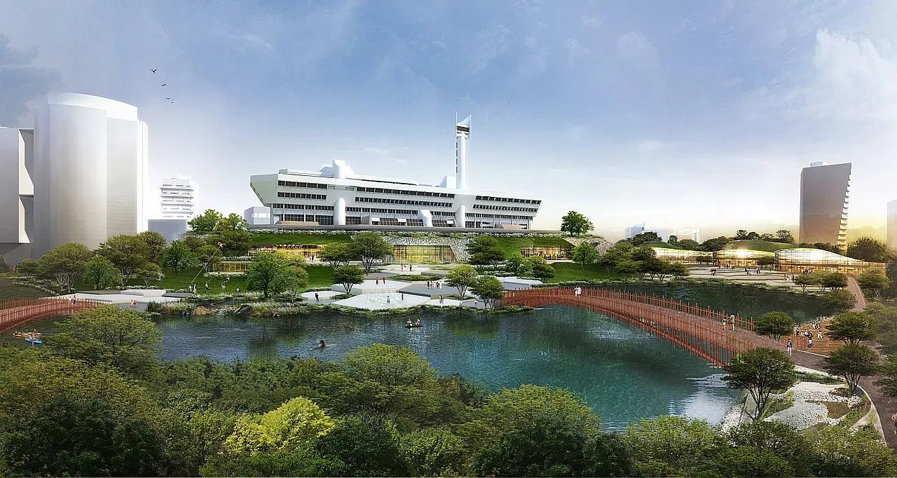 KCAP Architects&Planner's proposal comprises four large interconnected parks, buildings 30 to 40 storeys high each with a rooftop garden, and a canal that borders the district centre.