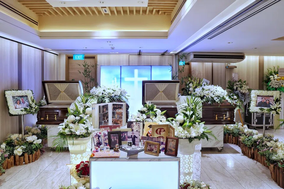 At the wake, which continues on Dec 29, white flowers and muted silver decor flanked the two coffins, while a display table with a thick photo album of the couple's favourite photos was placed in front. Wreaths and condolence flower stands from friends and former colleagues spilt out of the room where the wake was held.