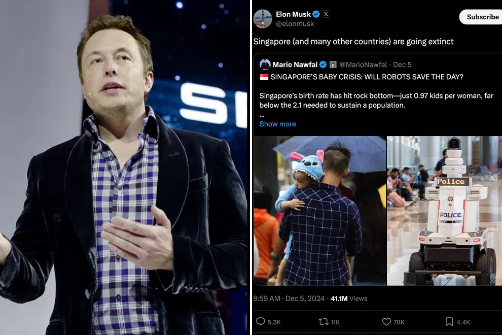 In a recent tweet on X, billionaire Elon Musk declared that Singapore, along with other countries, is "going extinct" because of its low birth rate.