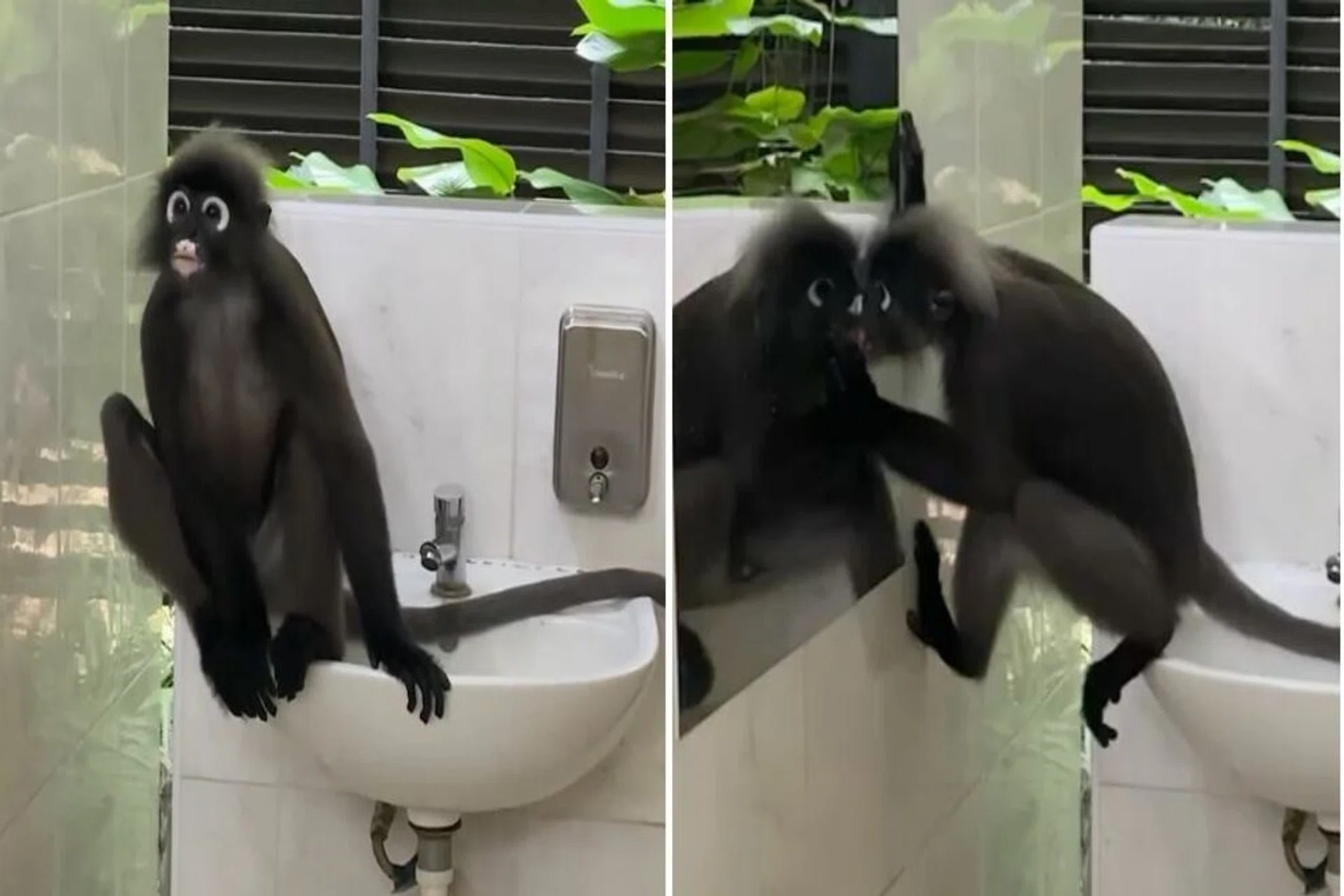 Endangered dusky langur spotted at nature reserve toilet licking its own reflection