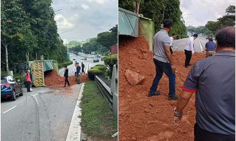 Exit on SLE closed after tipper truck topples; man taken to hospital