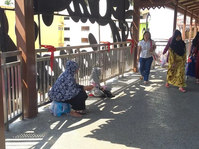 Two more beggars, a woman and her child, turned up at the overhead bridge connecting Geylang Serai Market and Joo Chiat Complex at around noon.