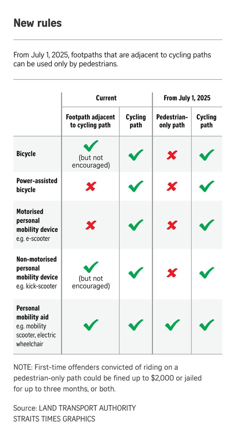 To give cyclists and users of non-motorised PMDs time to adjust to the move, enforcement will start only from July 1. First-time offenders convicted of riding on a pedestrian-only path could be fined up to $2,000 or jailed for three months, or both.