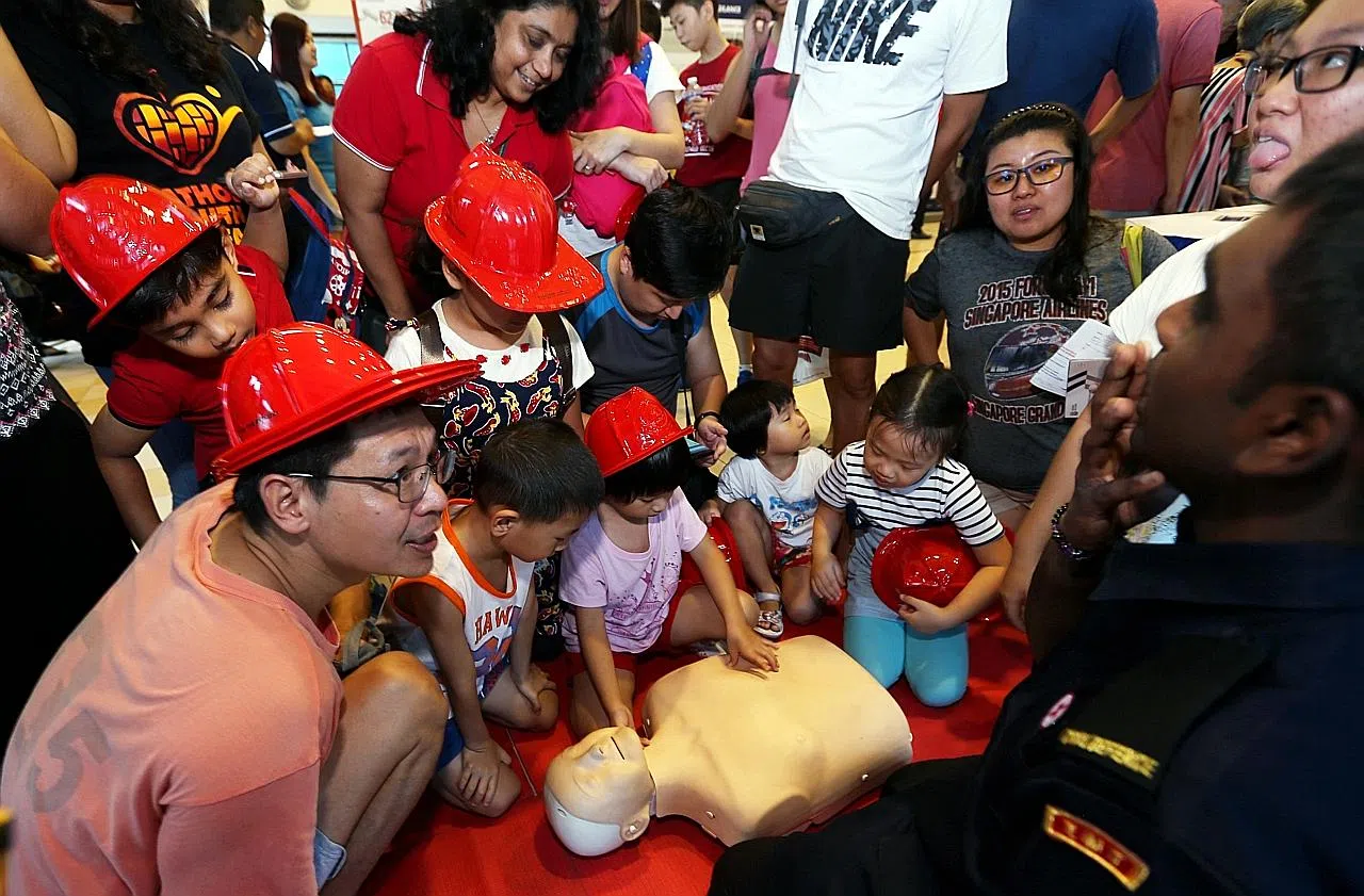 Residents and their children taking part in the Hong Kah North Emergency Preparedness Day yesterday morning at the Gek Poh Ville Community Centre. A mock terrorist attack was also staged at Gek Poh Shopping Centre.