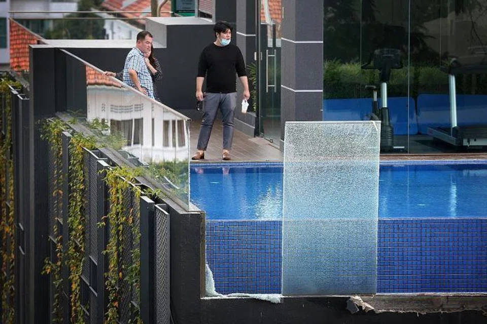 The glass walls of a swimming pool on the fifth storey of a condominium at Lorong Limau, off Balestier Road, suddenly gave way yesterday afternoon, sending glass panels and thousands of litres of water crashing to the ground.