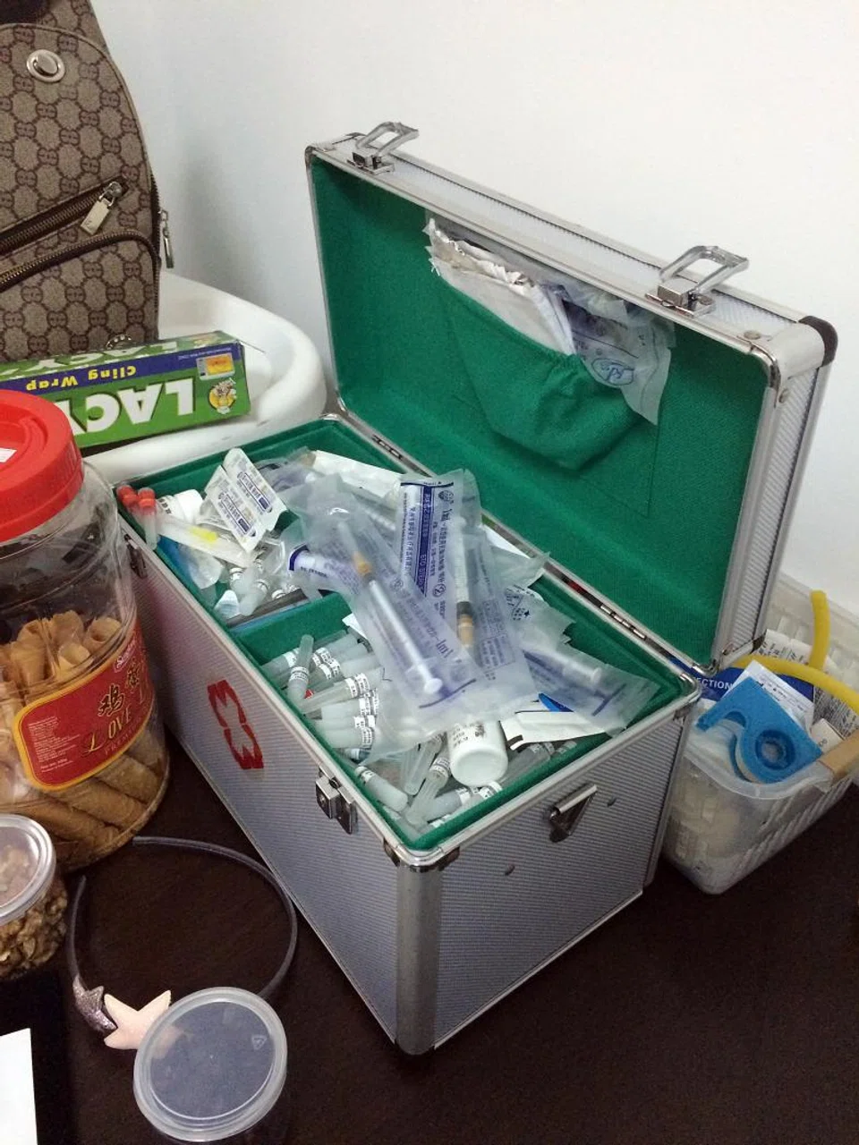 A peek inside revealed disposable syringes and needles of varying sizes, and little bottles with unknown chemicals.