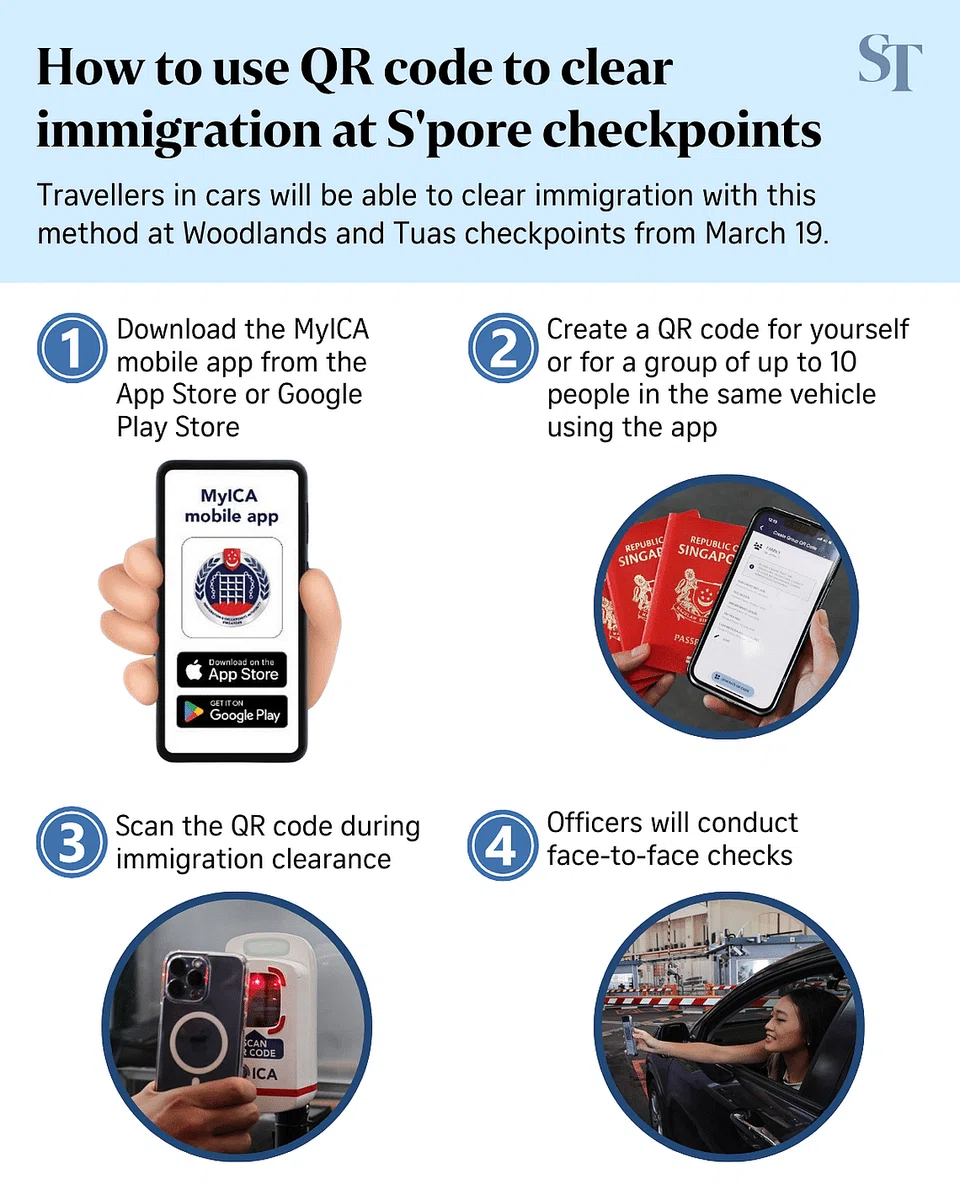 Before travelling to the checkpoints, motorists are also advised to check the traffic situation via the Land Transport Authority's One Motoring website or the Expressway Monitoring Advisory System installed along Bukit Timah Expressway and Ayer Rajah Expressway.