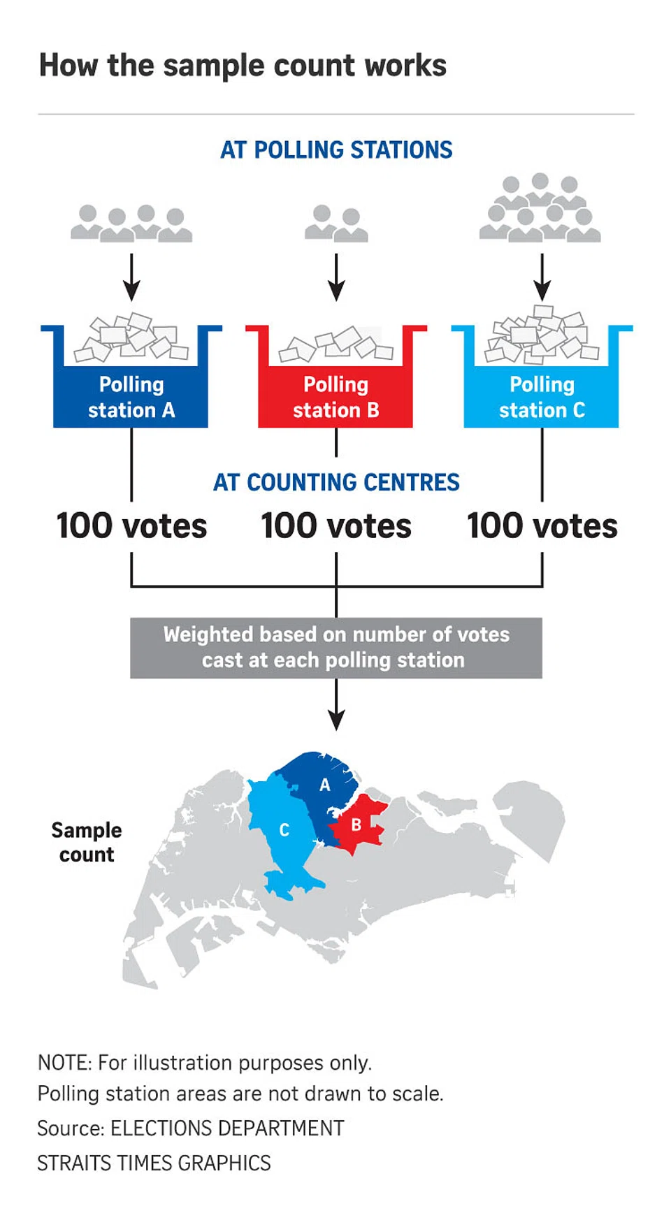 A: Unlike in a general election, where sample count results are announced for each constituency, the sample count for the presidential election will be for votes across the whole country.