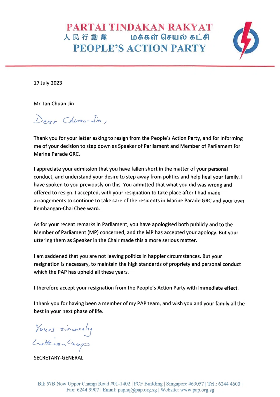 During the discussion, Mr Tan agreed to leave immediately, due to both his unparliamentary conduct as well as his inappropriate relationship with Ms Cheng.