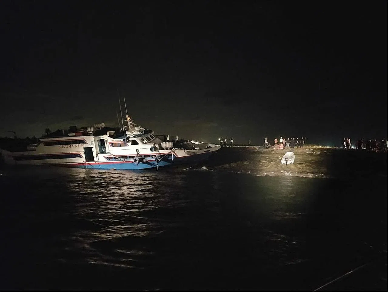 An Indonesian-flagged ferry, Sri Kandi 99, ran aground on a rock bund at the southern tip of Pulau Tekong late on Monday night.