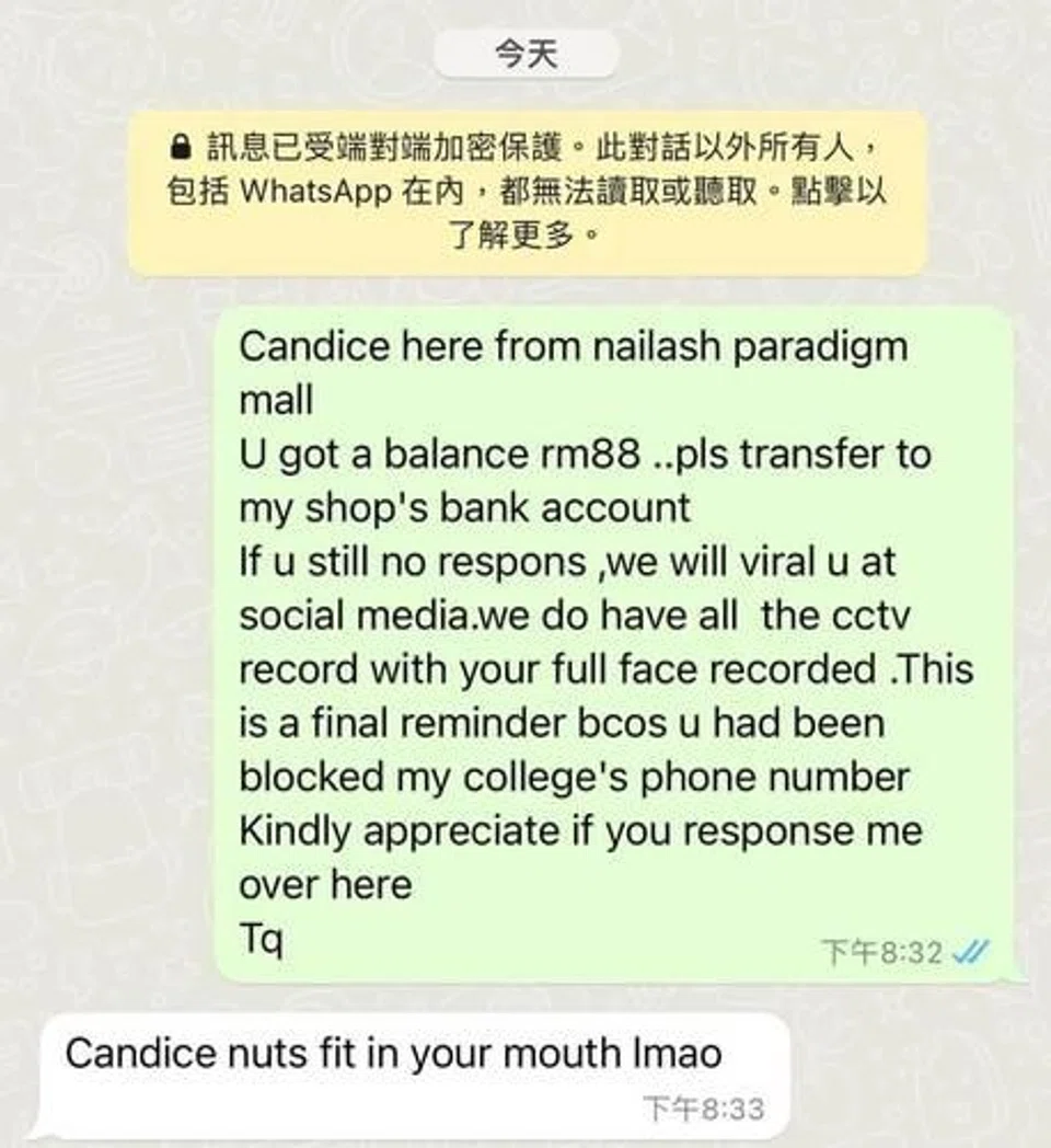 A nail salon in Johor Bahru is looking for a customer with a Singapore phone number who left without paying.