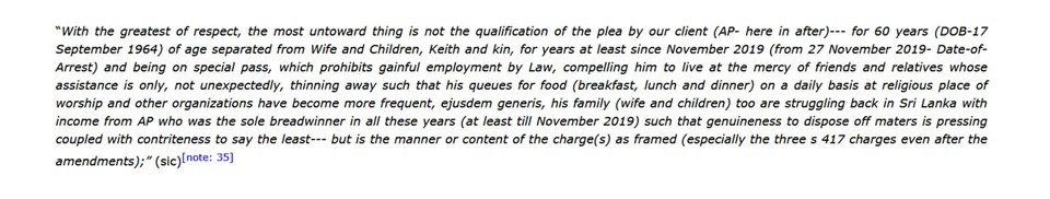 In the paragraph, among many other points, Mr Shanker said his client had to "live at the mercy of friends and relatives whose assistance is only, not unexpectedly, thinning away such that his queues for food (breakfast, lunch and dinner) on a daily basis at religious place of worship and other organisations have become more frequent".