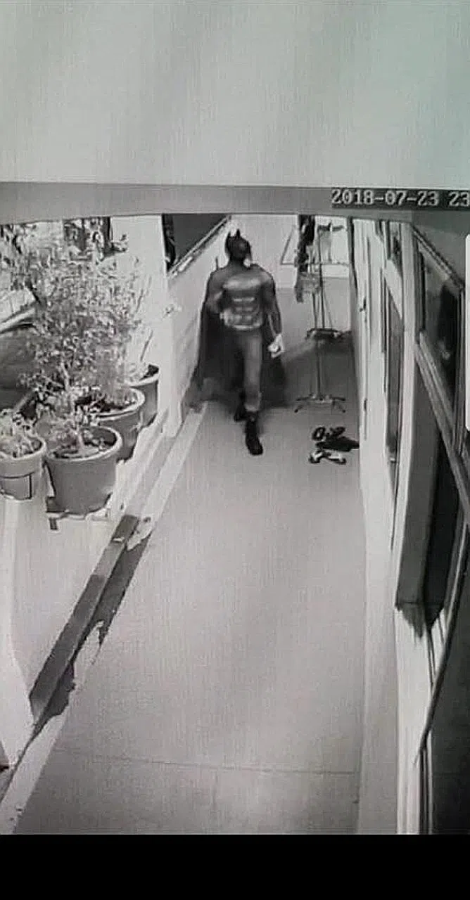 The owner of the security camera, who wanted to be known only as Mr Goh, told The New Paper at his flat yesterday: "I was taking a shower when my wife caught a glimpse of a tall, dark figure walking outside our flat. When she took a closer look, she saw it was Batman.