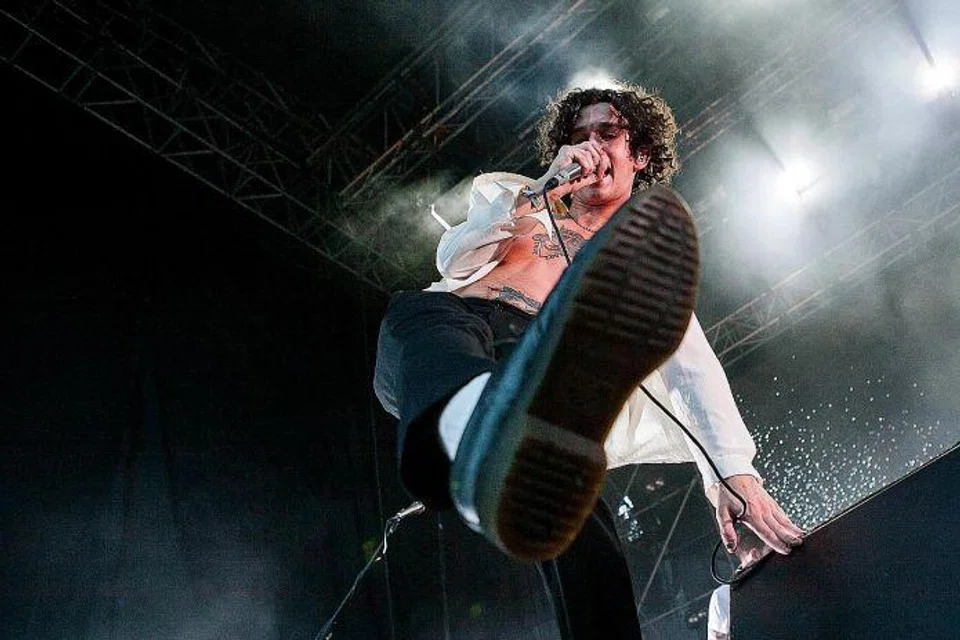 With the buttons of his white shirt undone, showing off a tattoo in the centre of his chest, The 1975's singer Matt Healy showed his bad-boy side during the British alt-rock band's set.