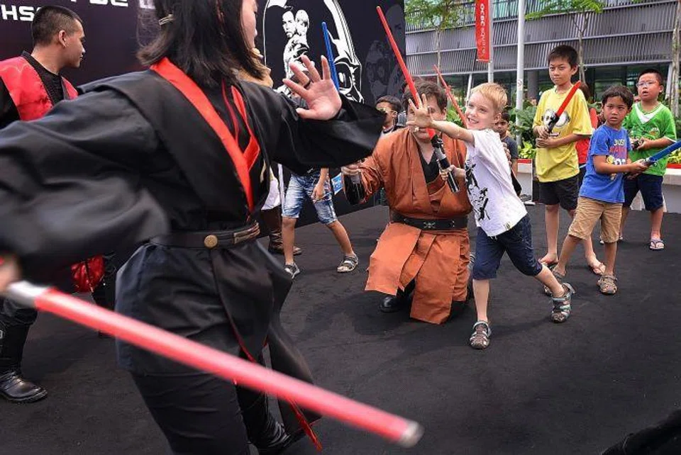 USE THE FORCE:Benjamin Scollon (in yellow) was among the children brought on stage to learn how to fight with lightsabers. TNP PHOTOS: ISKANDAR ROSSALI