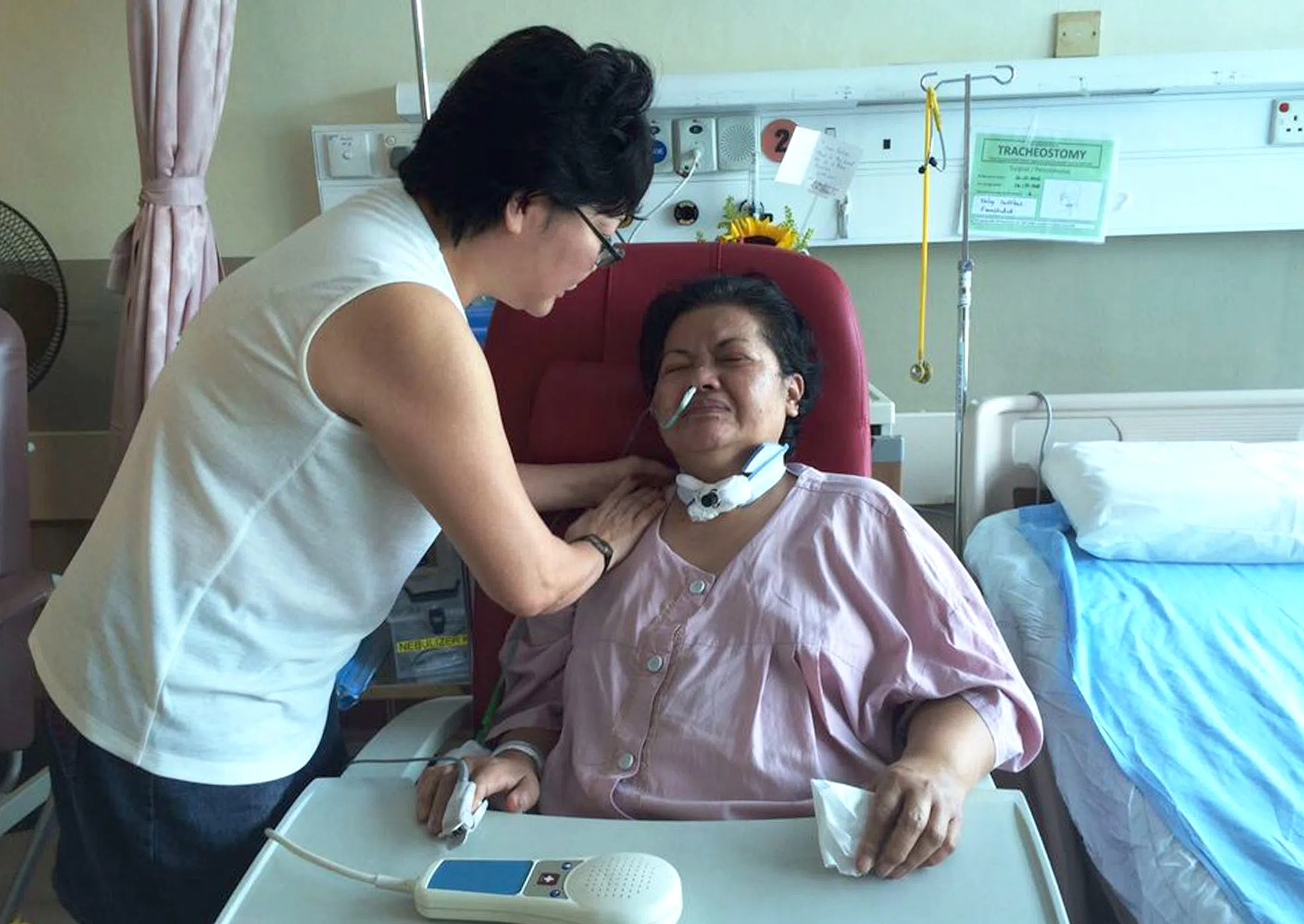 Madam Mico's recovery has been remarkable over the past few days - her tracheostomy tube was removed, and she can do simple exercises with her right hand.