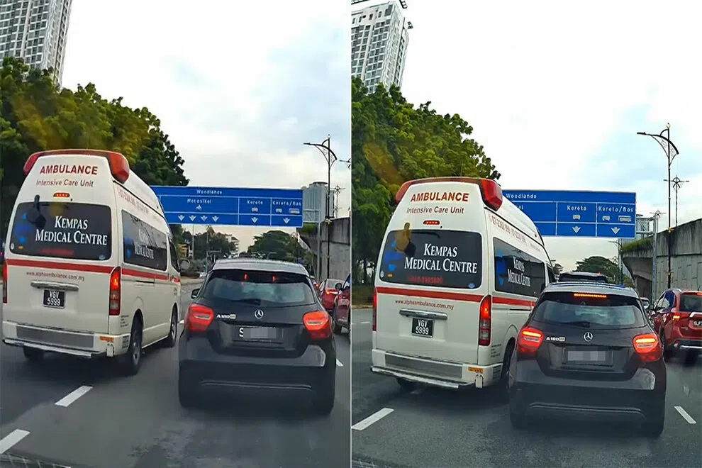 A Singapore-registered Mercedes and a Malaysian ambulance had a near collision in Johor Bahru on Dec 6 that was captured on video.