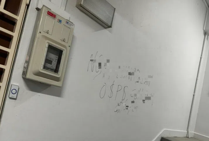 The door of a flat at Bedok South Avenue 2 was found to have been splashed with red paint and the wall by the staircase landing next to the unit scribbled.