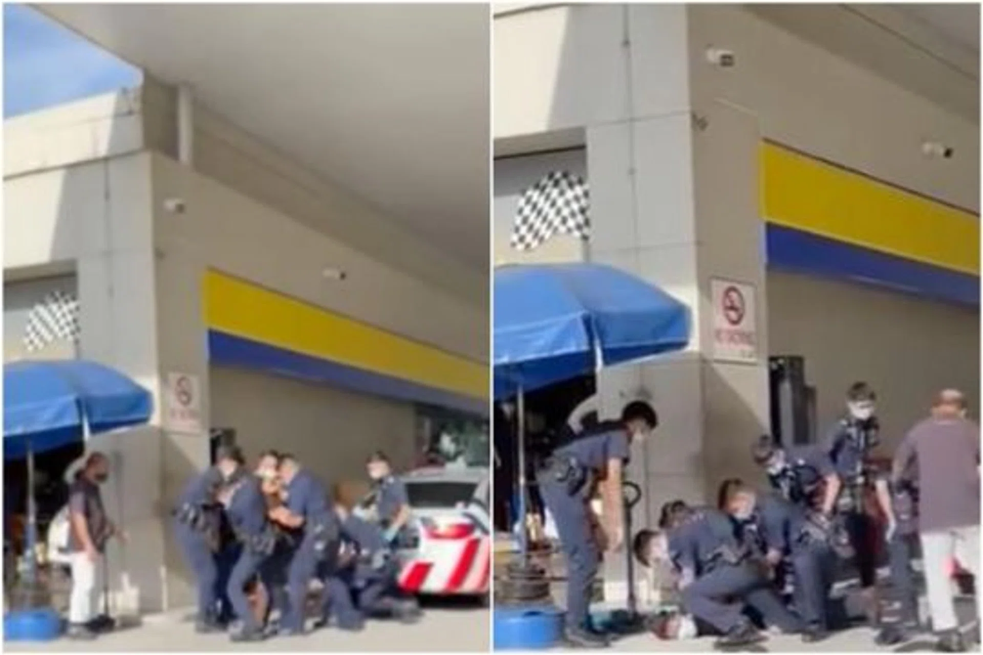 In a video of the incident that has been circulating on social media, seven police officers can be seen attempting to restrain a man at what appears to be a petrol station.