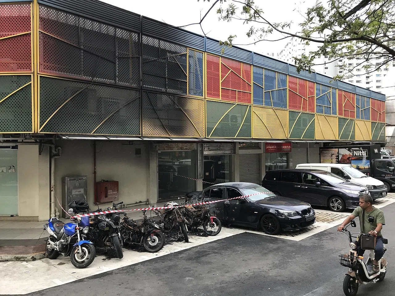 A customer at a nearby coffee shop saw the fire and called the police. Firefighters were dispatched by the Singapore Civil Defence Force but by the time they arrived, the fire had damaged five motorcycles and the car. Only one of the vehicles survived the fire.
