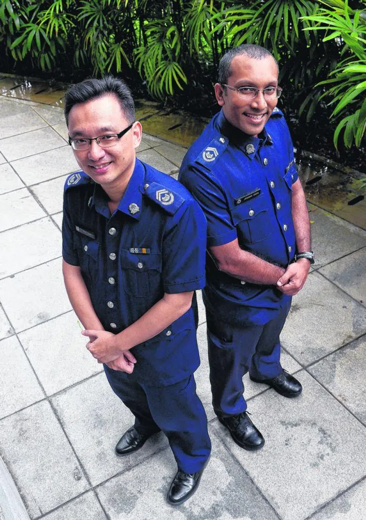SAVIOURS: Station inspectors Quek Suan (left) and Jahabar Sadiq were coming out of a meeting last November when they were told that a man had collapsed in a courtroom. TNP PHOTOS: CHOO CHWEE HUA