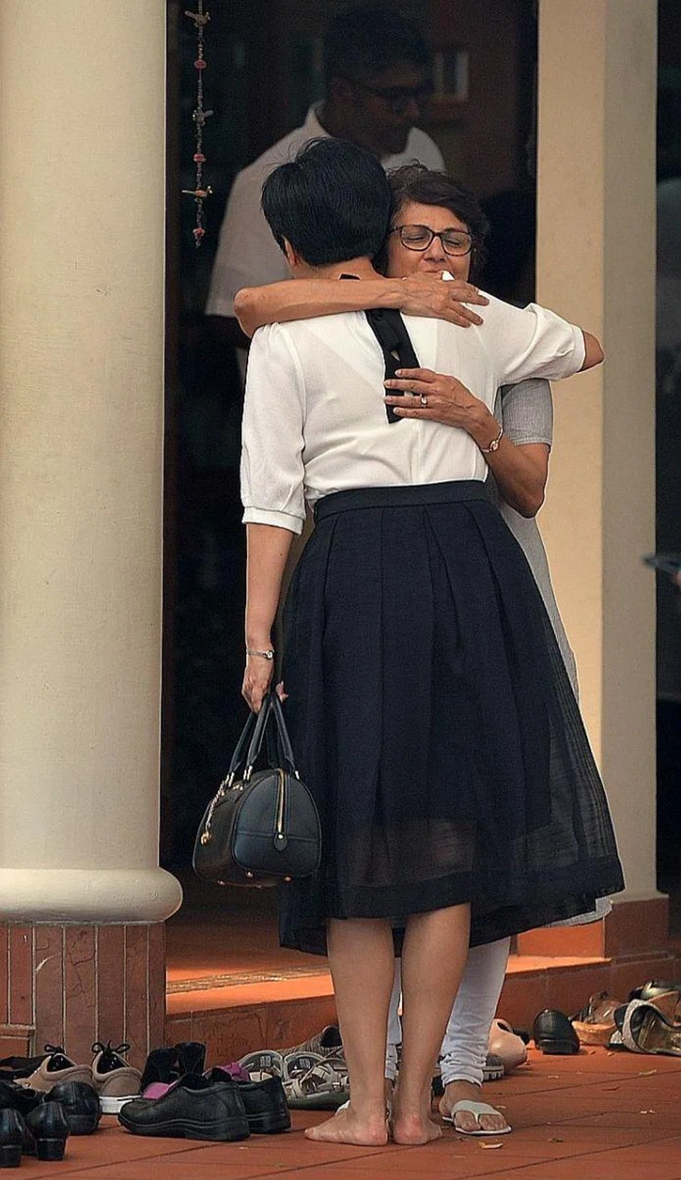 VISITORS: (Above) Ms Idranee Rajah hugging Mr Nathan's daughter Juthika Ramanathan.