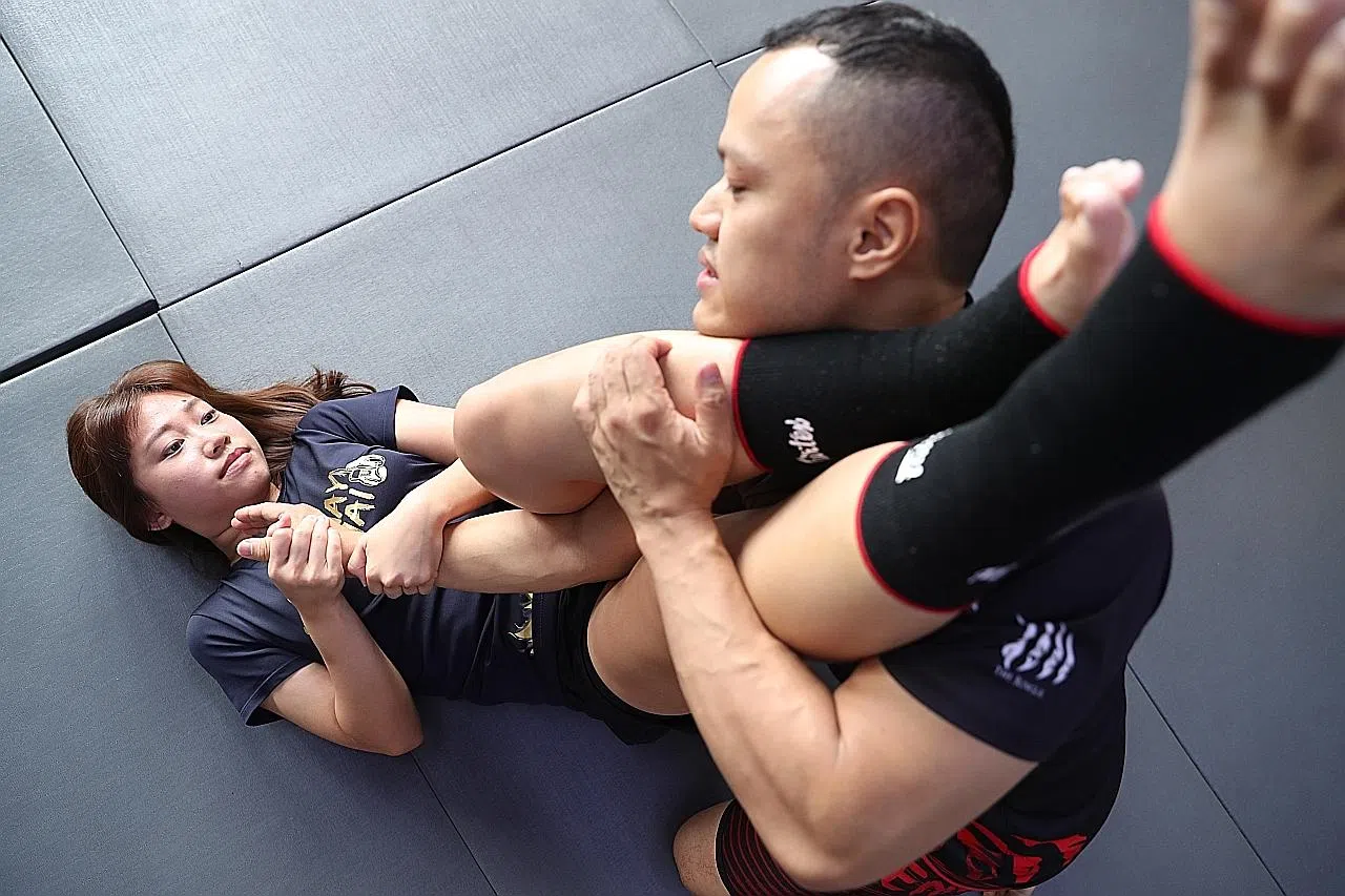 Madam Emily Tan, 47, takes self-defence classes at Kapap Academy with her two teenage daughters and husband.