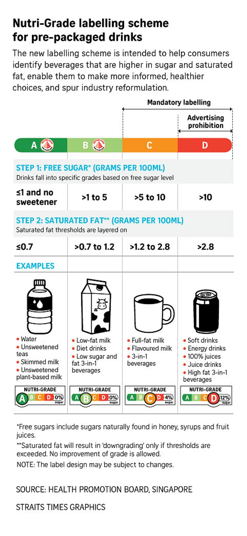 MOH announced the Nutri-Grade mark in 2019, comprising four grades classifying drinks from A to D, with D being the unhealthiest. The products include fruit juices and juice drinks, soft drinks, milk and yogurt drinks, and instant powdered beverages.