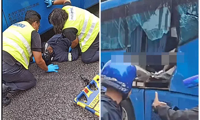 Chinese-language newspaper Shin Min Daily News reported on May 20 that one of the riders had jumped off his motorcycle to avoid getting hit by a car, and crashed into the side of a blue bus - a Malaysian-registered bus used to ferry workers - that was passing by.
