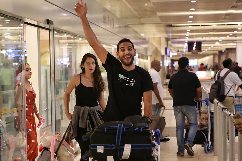 The New Paper greeted them at the Terminal 2 arrival hall where they were all smiles despite spending a total of 20 hours in the air.