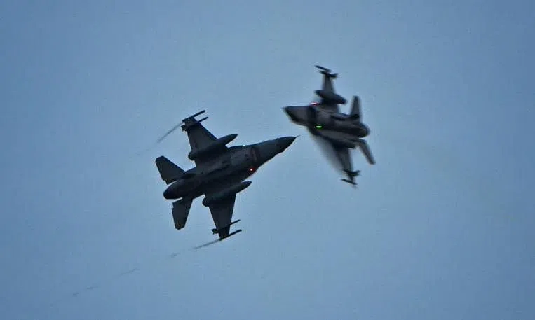 Meanwhile, an F-15SG aircraft came in the opposite direction, flying towards the intersection of the F-16D+ flight paths. After crossing the intersection point, it pulled upwards in a vertical climb. It was not just a sight to behold, but an aural experience too, as the sound of the aircraft engines pierced the air with deafening roars.
