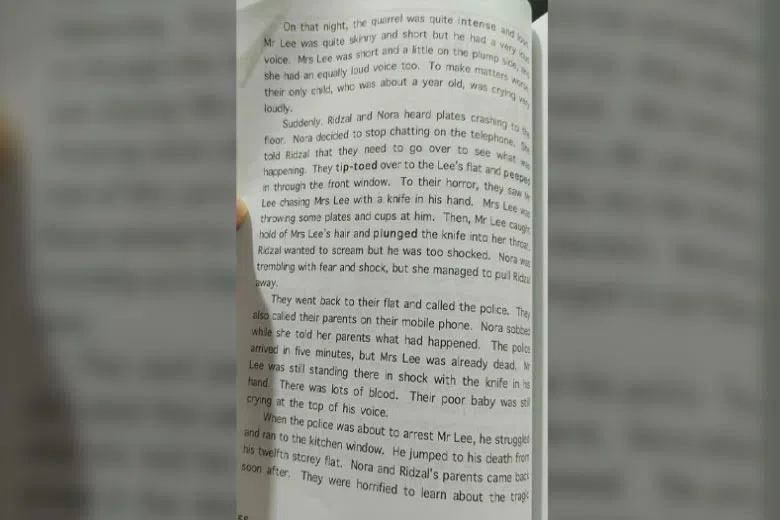 Facebook user Sikorsky Null shared a photo of a page from Model Compositions 5/6 published by Dolphin Publications in the Complaint Singapore group page and said that it had a "clear explanation on the murder itself".