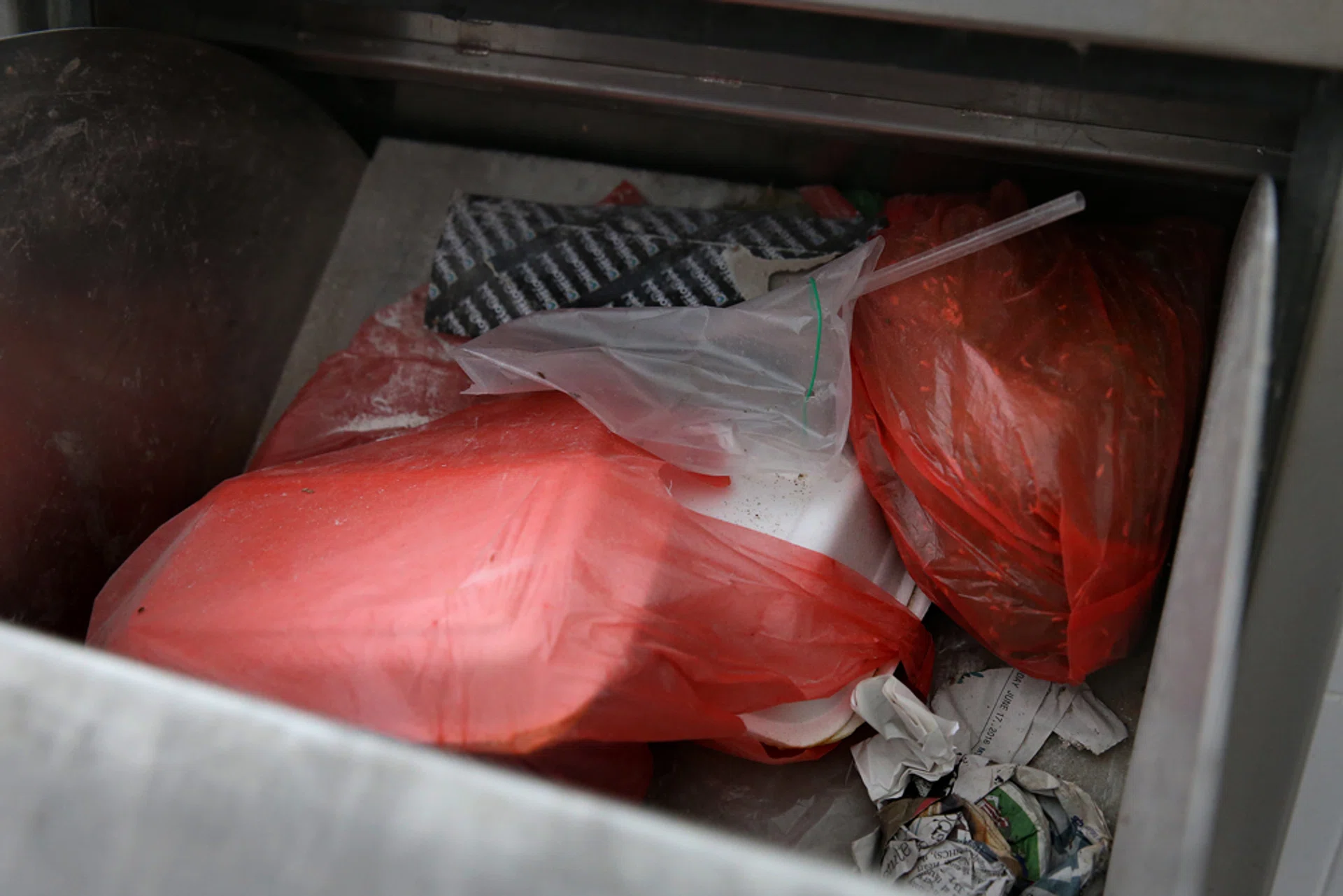 When this reporter checked the chute on the seventh floor, there were bags of food waste - polystyrene containers wrapped in plastic bags. A closer look revealed maggots that could be seen writhing under the red plastic.