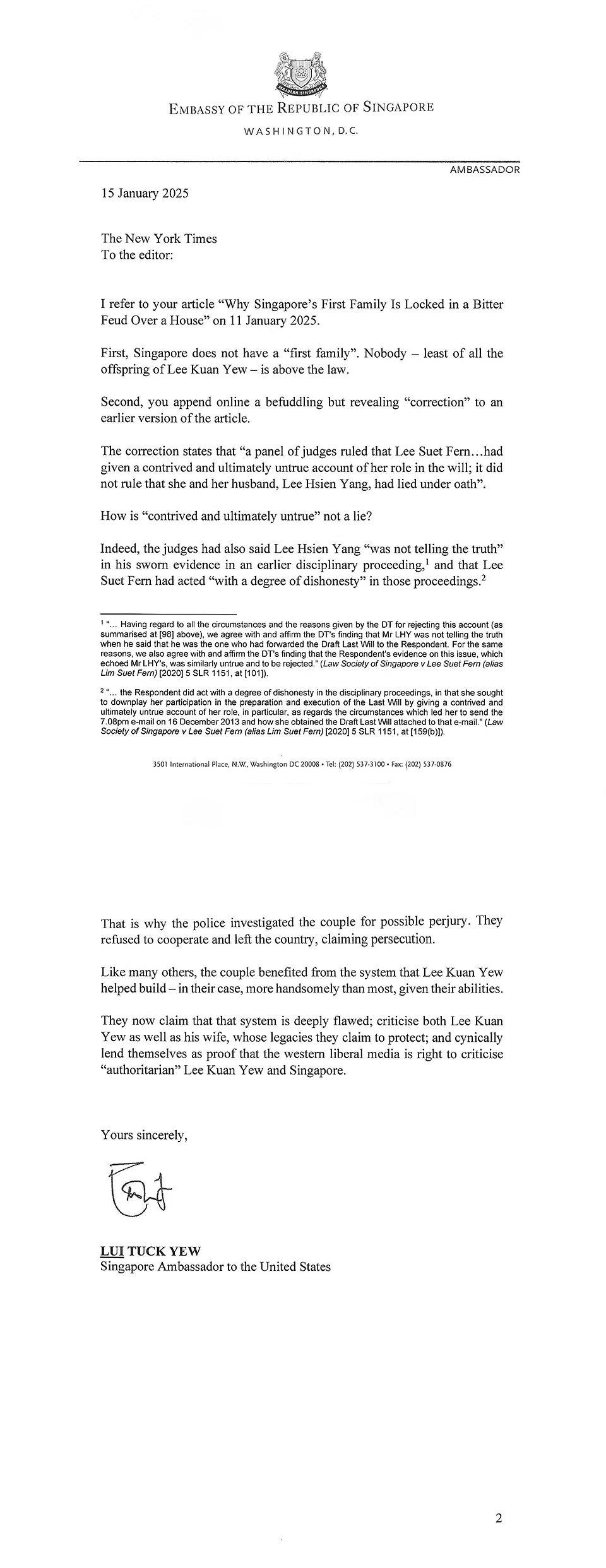 In a separate Jan 15 letter, Mr Lui responded to a Jan 11 NYT article on 38 Oxley Road, titled "Why Singapore's First Family is locked in a bitter feud over a house".