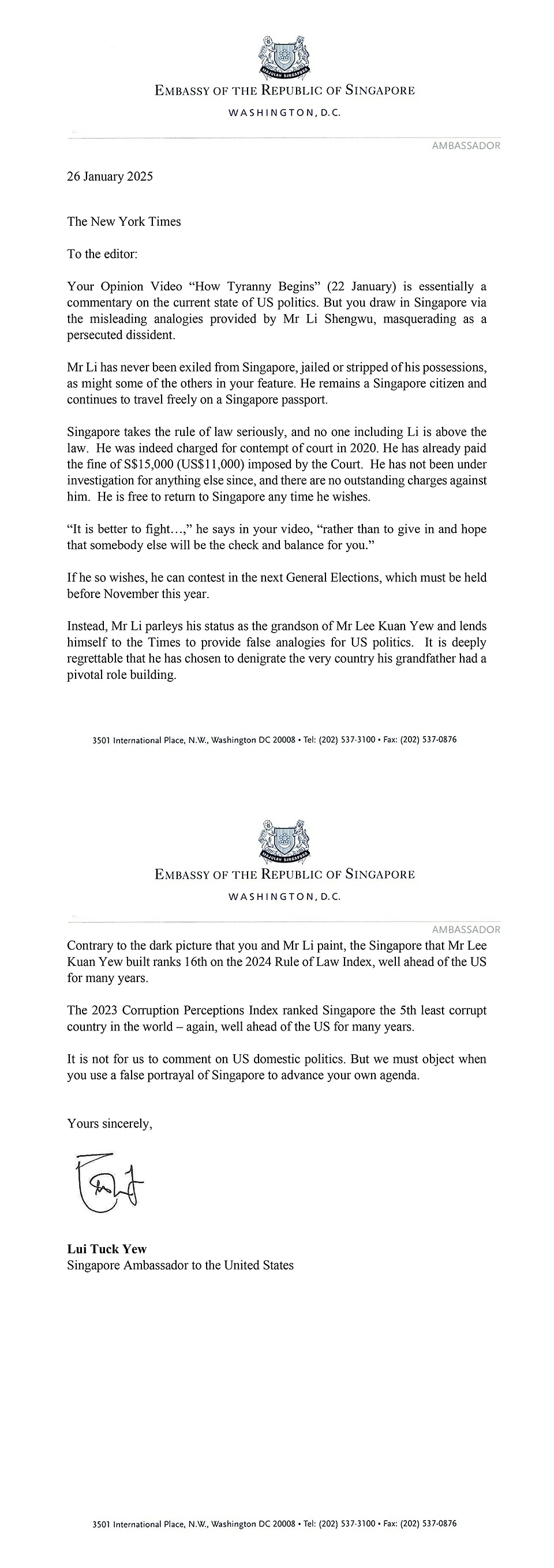 Singapore's Ministry of Digital Development and Information (MDDI) on Jan 27 released to local media this letter and another responding to a separate NYT article.