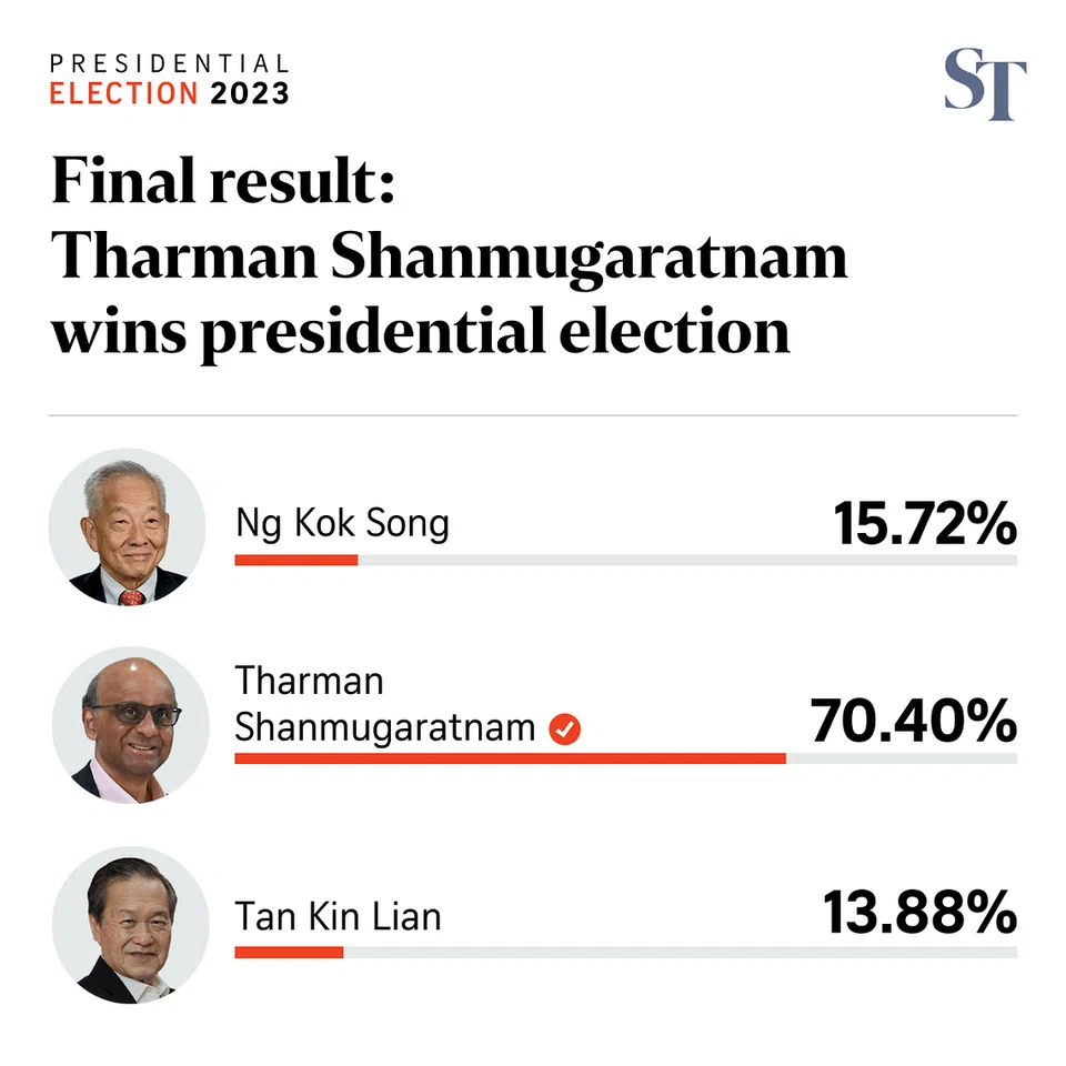 The final result saw Mr Ng take 15.72 per cent of the vote, or 390,041 votes, compared with Mr Tharman's 70.4 per cent and Mr Tan Kin Lian's 13.88 per cent.