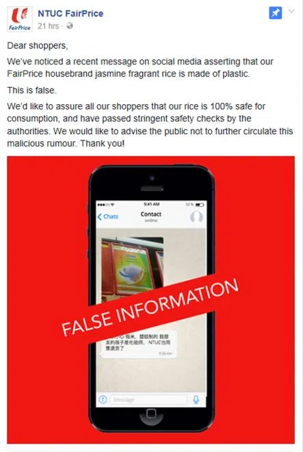 He added that NTUC FairPrice would be putting up notices at its stores to inform shoppers of the hoax.