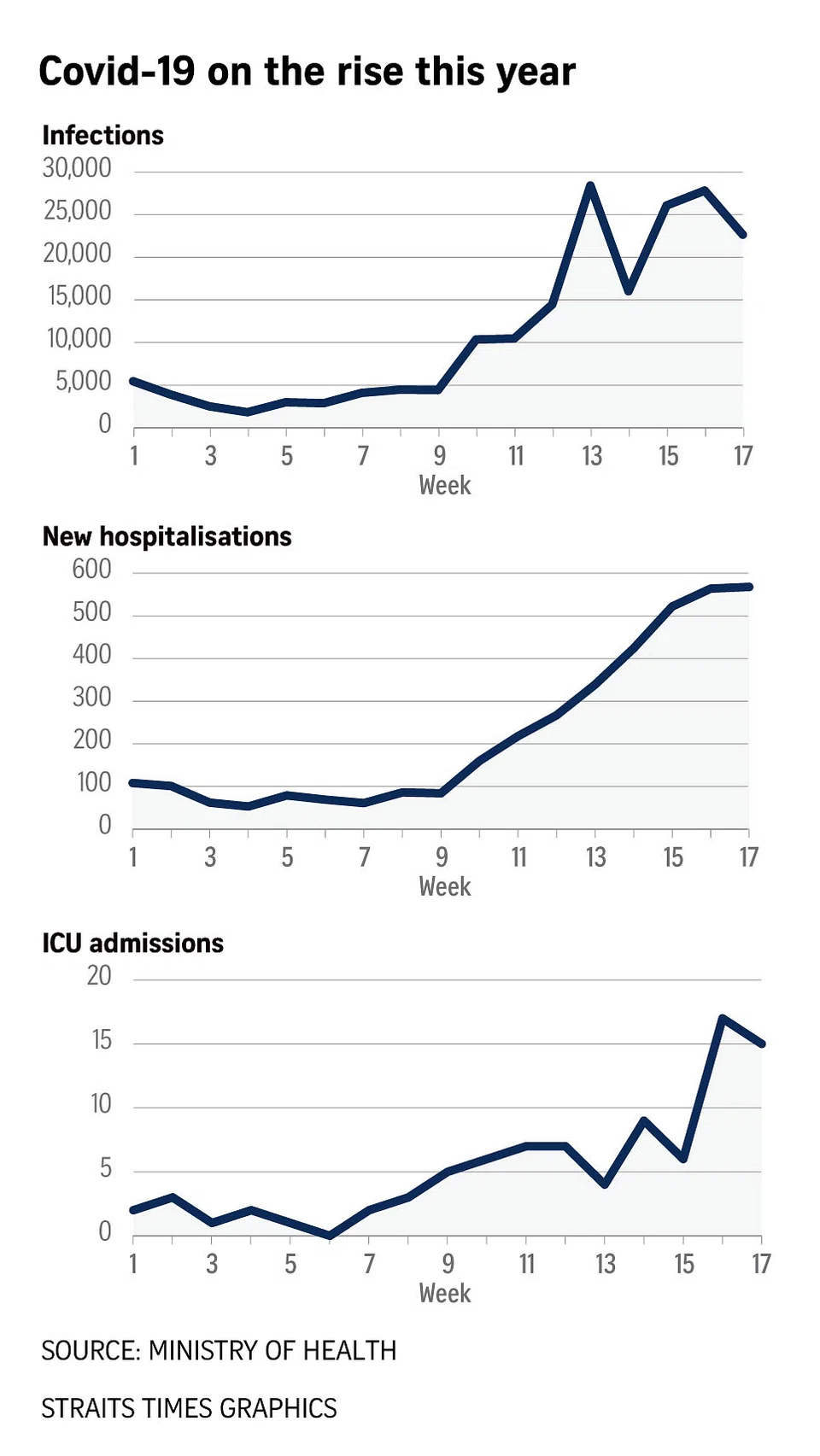IHH Healthcare Singapore, which runs four private hospitals and more than 30 GP clinics, said it has seen about 10 per cent more patients suffering from upper respiratory tract infections - which include Covid-19, influenza and the common cold - over the past two weeks. But the number is 20 to 30 per cent higher than in March, and the increase in such infectious diseases has been gradual, its spokesman said.