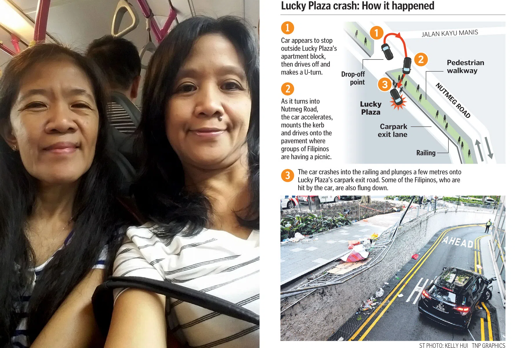 The sisters were among six Filipinas hit by the car, which then crashed through a railing and plunged onto the Lucky Plaza carpark exit road, taking four victims down with it.