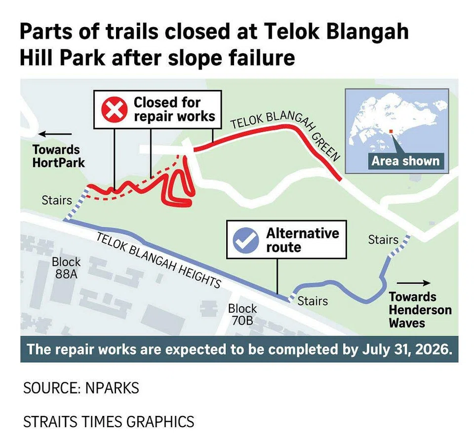 Parts of the trails at Telok Blangah Hill Park have been closed for repairs till July 2026 after a slope failure.