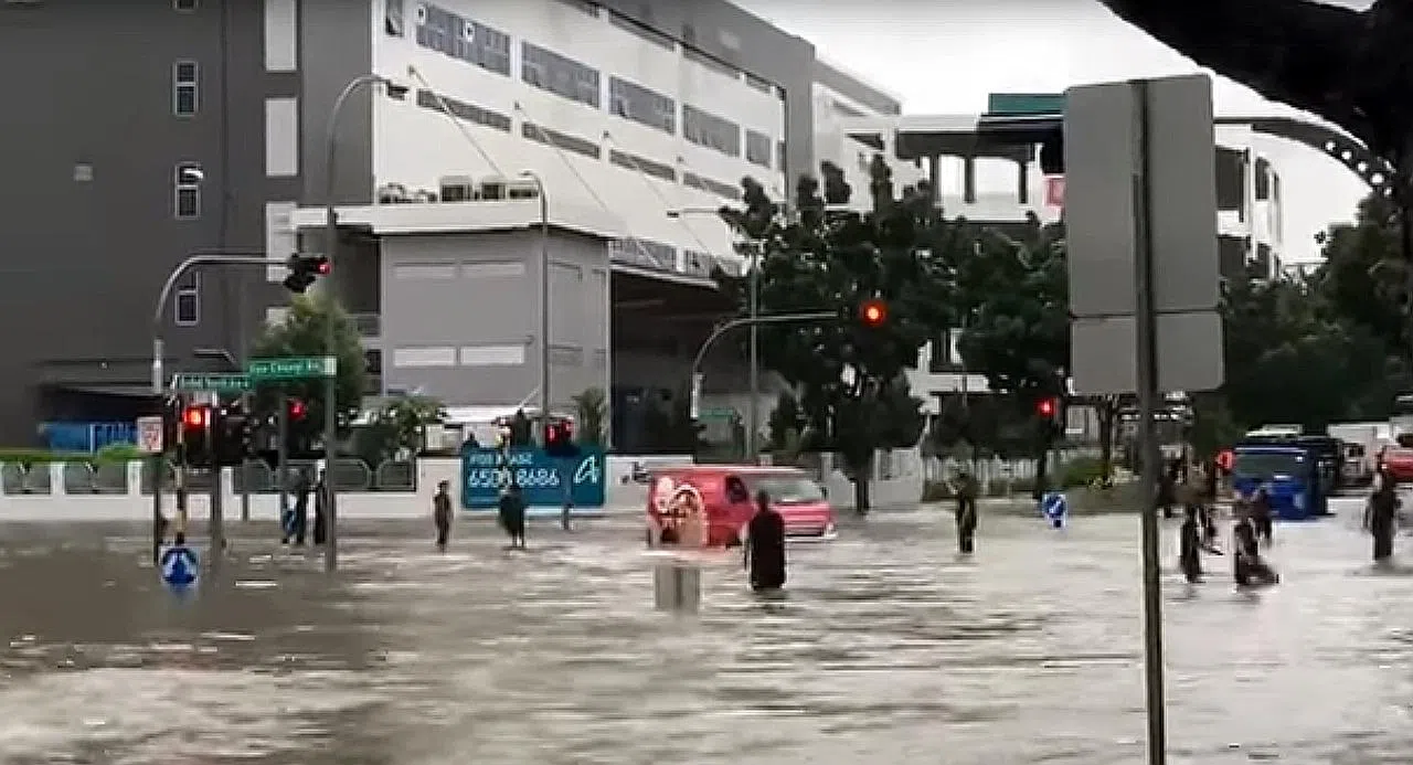 A video on Facebook showed water nearly engulfing bus stop seats at Bedok North Avenue 4 and the bottom half of a traffic light was submerged.
