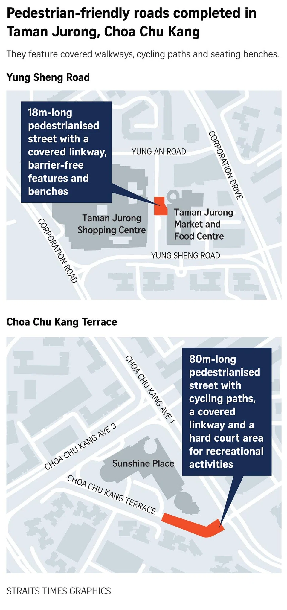 Two road-repurposing projects to create pedestrian-friendly streets in Taman Jurong and Choa Chu Kang have been completed.