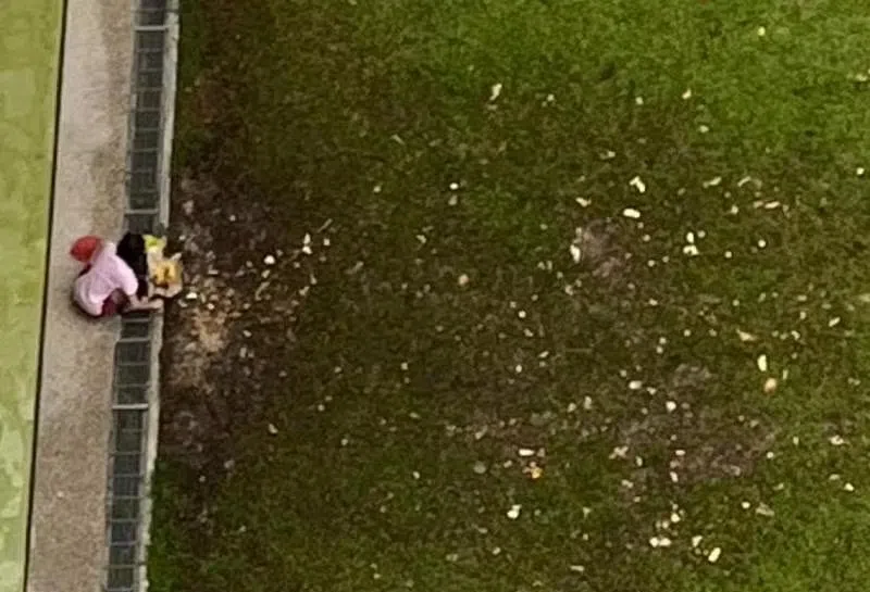 The woman, known only as Madam Huang, 52, has been gathering discarded food from dustbins and leaving it scattered across various lawns in the vicinity, turning the once-pristine green spaces into unsightly messes.