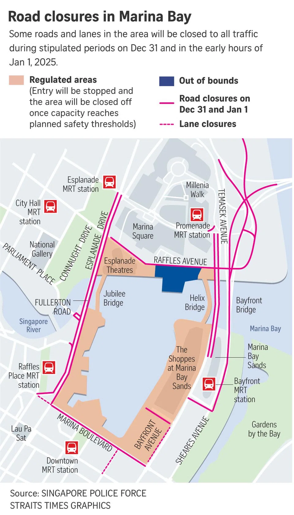 As in past years, many routes will be closed to facilitate the human traffic expected in the Marina Bay and Kallang Basin areas on Dec 31.