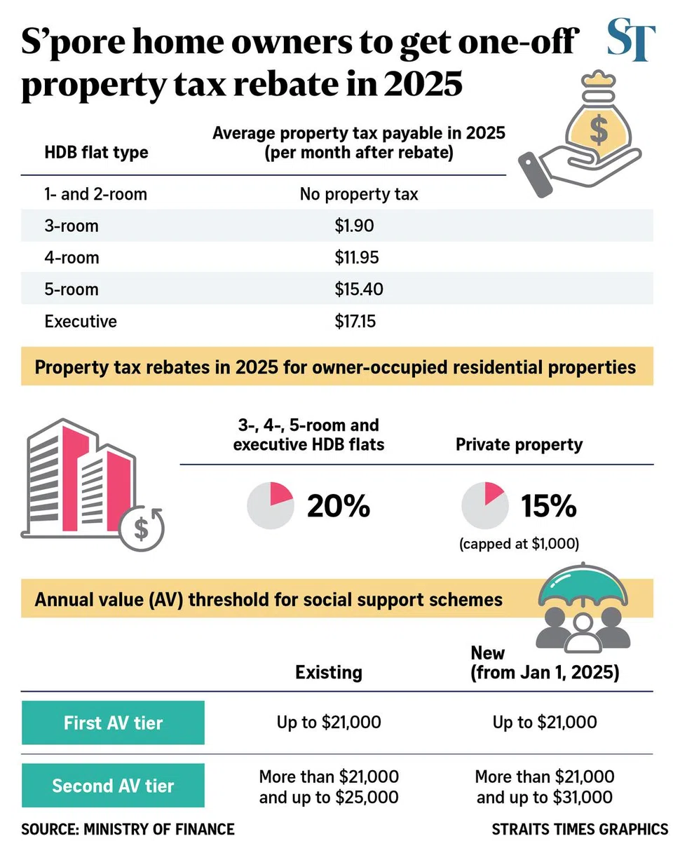 The rebates, together with the changes to annual value bands for owner-occupied homes that will kick in from 2025, will mean all such HDB flats and over 90 per cent of such private residential properties will see a lower tax bill in 2025.