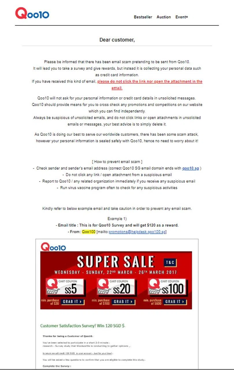 The advisory from Qoo10 included screenshots of the scam e-mails, which appeared to promise as much as $120 worth of credit in exchange for the completion of a short survey.